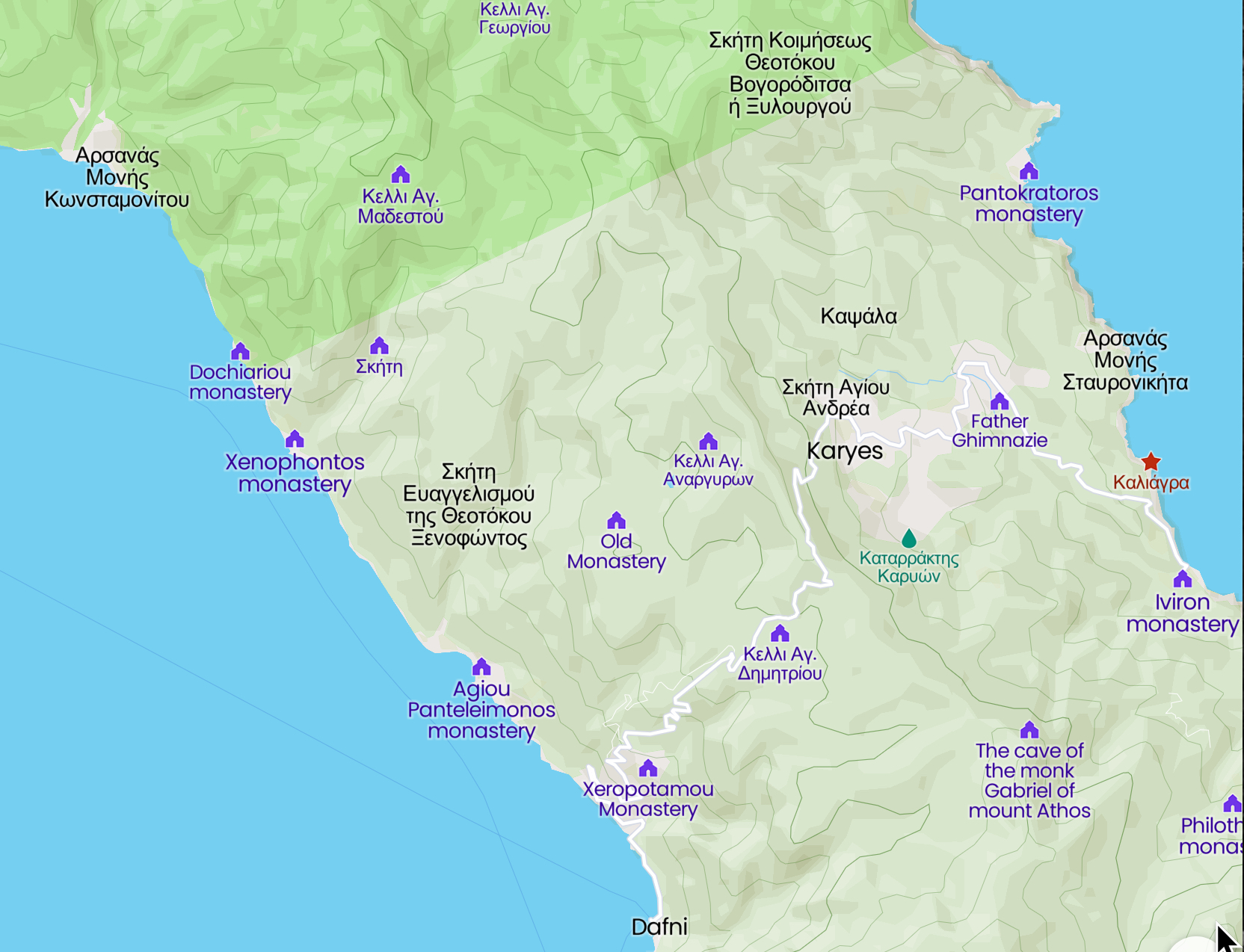 By this time I have decided against any itinerary that brings me back to Karie, or involves the bus, or, to begin at least, the presence of humans with or without mules. The girly magazine on the policeman’s desk was the last straw. I find a restaurant where they have two kinds of soup, and bread and water. By now I am very hungry, all of it tastes like nectar and ambrosia to me. It is twelve o’clock. A shop keeper and a monk convince me, which much miming off wild boar and lack of signposts, not to set off for Monastery Konstamido.